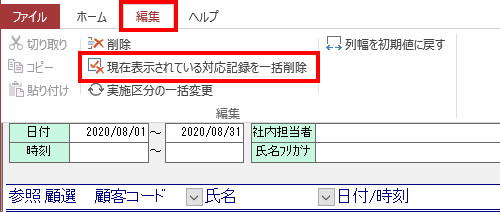 | (2) | 画面上部の[編集]メニューをクリックし、[現在表示されている対応記録(または販売履歴)を一括削除]をクリックします。 |
