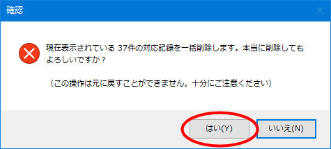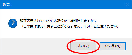 | (3) | 「現在表示されている対応記録(または販売履歴)を一括削除しますか?〜」という確認メッセージが表示されます。削除して良い場合は[はい]ボタンをクリックします。 |