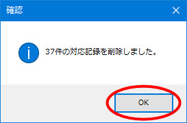 | (5) | 「○件の対応記録(または販売履歴)を削除しました。」という確認メッセージが表示されますので、[OK]ボタンをクリックします。 |
