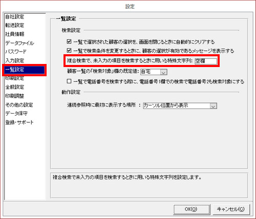 | 初期設定では、[設定]画面の[一覧設定]項目にある「複合検索で、未入力の項目を検索するときに用いる特殊文字列」に、「空欄」と設定されています。これにより、以下のように、特定の項目が未入力の顧客を抽出することができます。 |