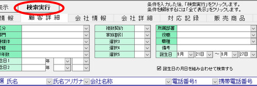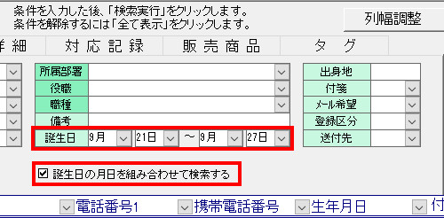 | 例:9月21日〜27日が誕生日の顧客を検索する。 |