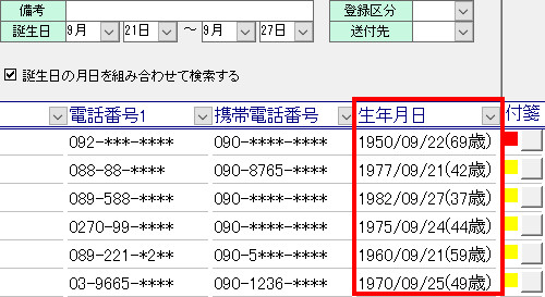 | ※任意の列を「生年月日」に変更すると確認できます。 |