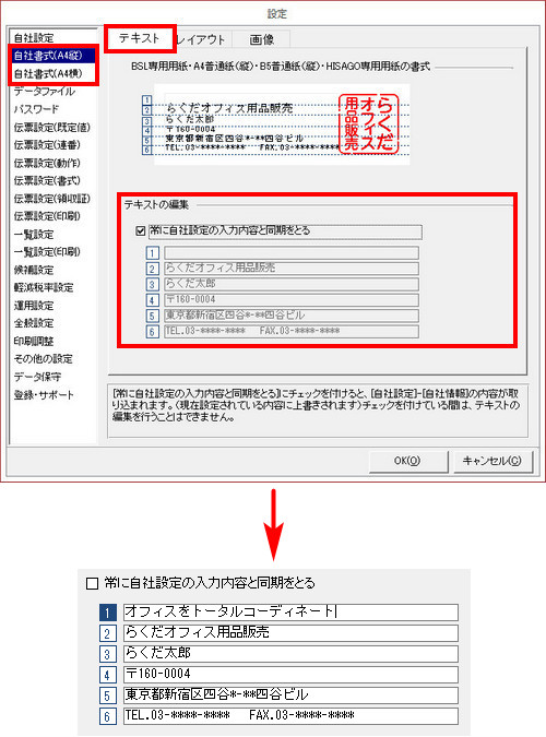 | ※[常に自社設定の入力内容と同期をとる]にチェックがついていると、[自社設定]で自社情報が編集された時、自動的に自社書式に反映されます。チェックを外すと文字列を自由に編集できます。 |