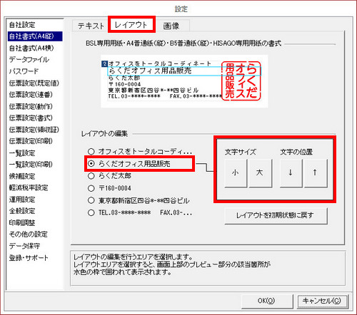 | (4) | [レイアウト]タブをクリックし、「レイアウトの編集」内で、文字サイズ・文字の配置を変更したい文字列を選択してから、右側の「文字サイズ」「文字の位置」のボタンでサイズ・位置を変更します。 |
