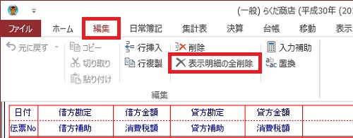 | (2) | 画面上部の[編集]メニューをクリックし、[表示明細の全削除]をクリックします。 |