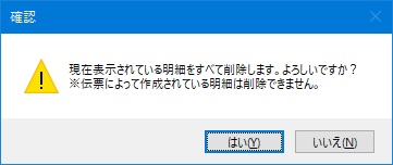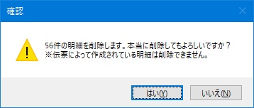 | (4) | (3)で[はい]ボタンをクリックすると、「○件の明細を削除します。〜」という確認メッセージが表示されますので、実行して良い場合は[はい]ボタン、中止したい場合は[いいえ]ボタンをクリックします。 |