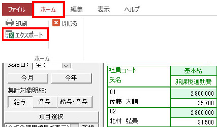 | (1) | 集計表(または賃金台帳)画面左上、[ホーム]メニュー内にある[エクスポート]をクリックします。 |