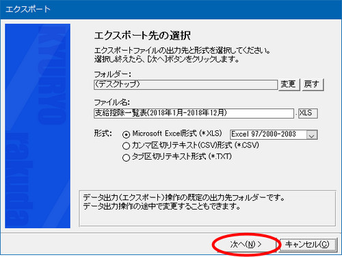 | (2) | 「エクスポート先の選択」画面が表示されますので、出力したい場所・ファイル名・形式を指定して、[次へ]ボタンをクリックします。 |