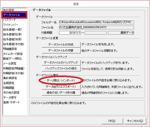 | (2) | [データファイル]内にある、[データ取込(インポート)]ボタンをクリックします。 |