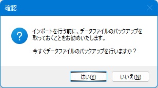 | (3) | 「〜今すぐデータファイルのバックアップを行いますか?」という確認メッセージが表示されます。既に何らかの台帳・明細データを入力済みの場合は、[はい]ボタンでバックアップを実行してください。何も入力されていない場合は、[いいえ]ボタンをクリックします。 |