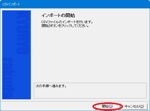 | (4) | (3)のバックアップ処理完了後、または[いいえ]ボタンをクリックした後、「インポートの開始」画面が表示されますので、[開始]ボタンをクリックします。 |