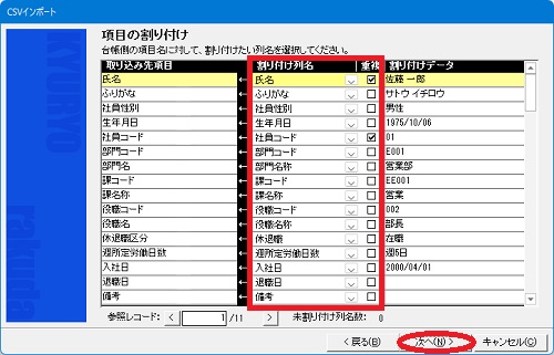 | ※製品側の項目名とCSVファイル側の列名が一致または類似している場合は自動的に割り付けられますが、必要に応じて変更してください。 |