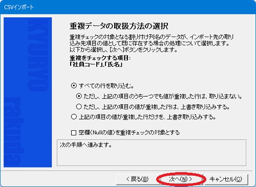 | (7) | 「項目の割り付け」画面で[重複]欄に1カ所以上チェックを付けた場合、「重複データの取扱方法の選択」画面が表示されます。重複するデータが存在した場合の処理方法を選択し、[次へ]ボタンをクリックします。 |