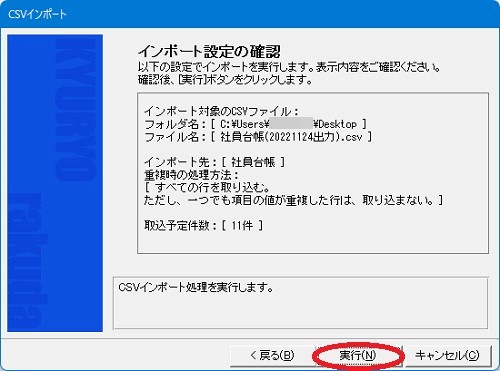 | (8) | 「インポート設定の確認」画面が表示されますので、[実行]ボタンをクリックします。 |