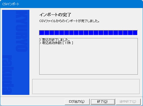 | (9) | インポート完了後、「インポートの完了」画面が表示されます。[ログ出力]ボタンをクリックすると、インポートしたCSVファイルと同じ場所にCSV形式のインポートログファイルが出力されますので、インポート状況の確認や取り込みに失敗したデータの確認等を行いたい場合にご参照ください。 |
