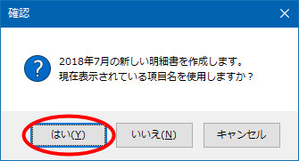 | (4) | 「○年○月の新しい明細書を作成します。現在表示されている項目名を使用しますか?」というメッセージが表示されますので、[はい]ボタンをクリックします。 |