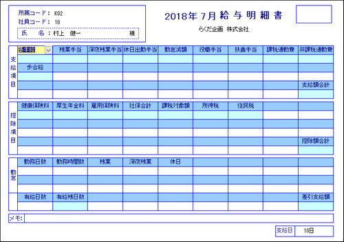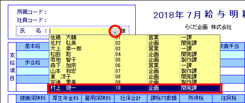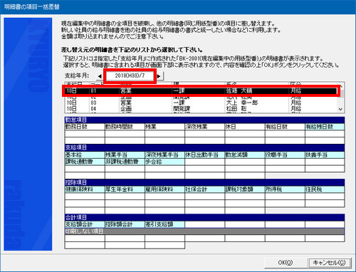 | 例:すでに作成されている「佐藤 大輔」(以後A)の2018年7月明細書の項目レイアウトを「村上 健一」(以後B)の2018年7月明細書に適用する。 |