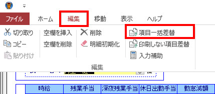 | (2) | 明細書画面左上の[編集]メニューをクリックし、[項目一括差替]をクリックします。 |