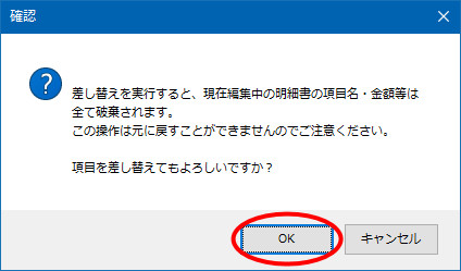 | (4) | [OK]ボタンをクリックし、「〜項目を差し替えてもよろしいですか?」というメッセージが表示されたら[OK]ボタンをクリックします。 |