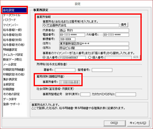 メインメニューの[設定]アイコンをクリックし、[自社設定]内にある「事業所情報」および「雇用保険(離職証明書)」の[事業所番号]欄を設定しておきます。 |