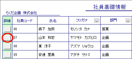 (2- | 2)「社員基礎情報」画面が表示されますので、対象者の[詳細]ボタンをクリックします。 |