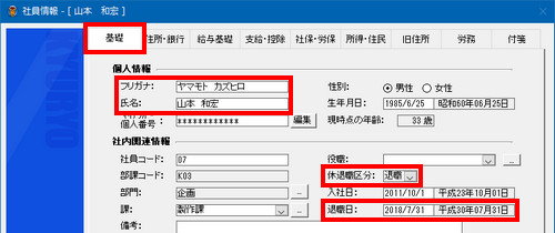 [基礎]タブ:[フリガナ][氏名][休退職区分][退職日]を設定します。 |