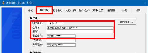 [住所・銀行]タブ:「現住所」を設定します。 |