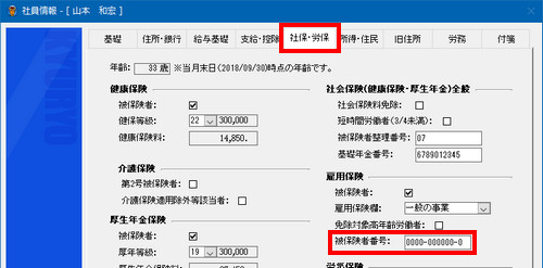 [社保・労保]タブ:「雇用保険」の[被保険者番号]を設定します。 |