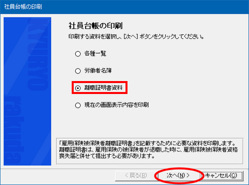 (3- | 2)「社員台帳の印刷」画面が表示されますので、[離職証明書資料]を選択し、[次へ]ボタンをクリックします。 |