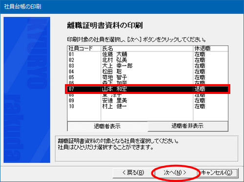 (3- | 3)「離職証明書資料の印刷」画面が表示されます。対象の社員を選択し、[次へ]ボタンをクリックします。 |
