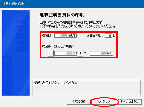 (3- | 4)[退職日][賃金締切日][賃金額一覧の出力期間]をそれぞれ設定し、[次へ]ボタンをクリックします。 |