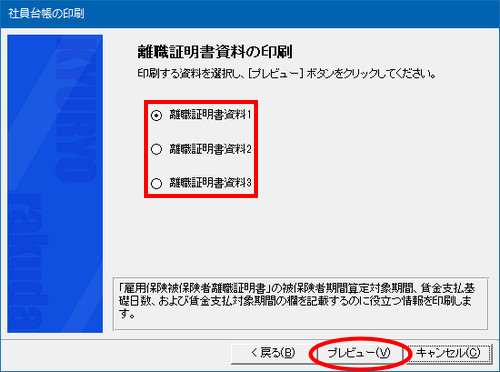 (3- | 5)印刷する離職証明書資料の種類を選択し、[プレビュー]ボタンをクリックします。 |