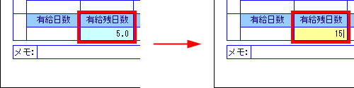 | 例えば、有給を10日付与する月の明細書を作成した際、前月からの繰越しで自動記入された「有給残日数」が「5」だった場合、これに付与する有給日数「10」を加算した「15」を手入力します。 |