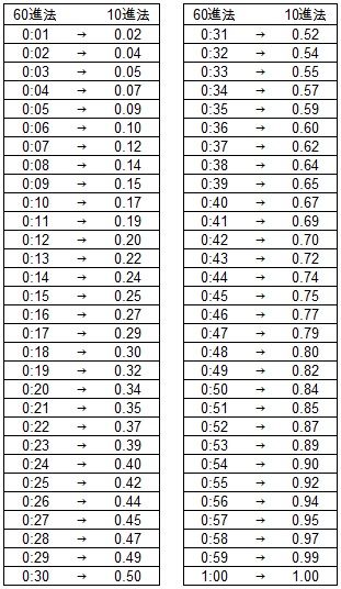| 60進法から10進法への変換結果については、以下の表をご参照ください。 |