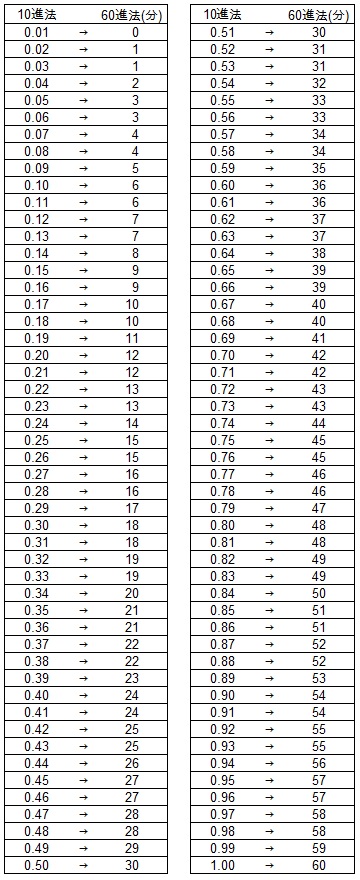 | 10進法から60進法への変換結果は以下の表をご参照ください。 |