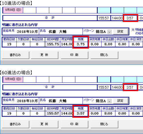 | 例えば、「タイムカード入力」画面で、「残業時間」の月合計が「3:57」だった場合、10進法では明細書に書き込む時点で、月の合計時間を15分単位または10分単位で切り捨て・切り上げ・四捨五入のいずれかの処理を行っています。(「タイムカード設定」画面→[書込設定]タブでの設定によります)設定が「15分単位」の「切り捨て」であれば、明細書に「3.75」(3時間45分)と書き込まれます。 |