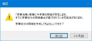 | 同じ年度での明細書出をすでに1度行っていて、その明細が残っている場合、「「家事消費」帳簿に今年度の明細が存在します。すでに家事按分の明細書出が実行されている可能性があります。家事按分の明細を作成してもよろしいですか?」という確認メッセージが表示されます。 |