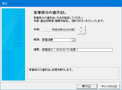 | 1回目に書き出しを行った際の設定によって明細がどの帳簿に書かれているかが異なりますが、通常、[帳簿]は「家事消費」、[摘要]は「家事按分((本日日付)処理)」となっています。 |