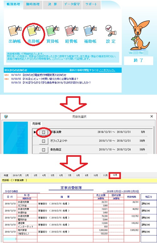 | 上図の状態で実行した場合、2018年12月31日の[家事消費]帳簿に書き出されていることになります。この場合は、メインメニュー[売掛帳]アイコンから[家事消費]帳簿を開き、対象年度の[12月]タブをクリックして、12月31日に書き込まれている家事按分の明細をご確認ください。 |