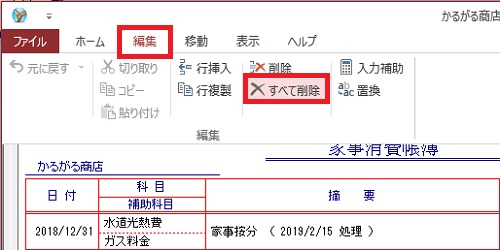 | [明細書出]で書き出されている明細行を削除するには、1行ずつ[行削除]ボタンで削除するか、表示されている明細すべてが削除対象であれば、[編集]メニュー→[すべて削除]で削除します。 |