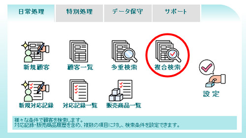 | (1) | メインメニューの[複合検索]アイコンをクリックして「複合検索」画面を開きます。 |