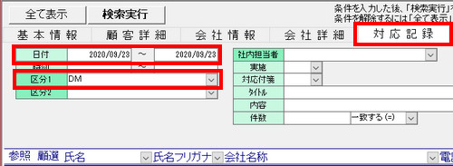 | (2) | 検索領域にある[対応記録]タブをクリックし、[日付]欄に「2020/09/23〜2020/09/23」と入力して、DMの記録を指定します。例えば、[区分1]欄に「DM」と入力してある場合は、[区分1]欄に「DM」と指定します。 |