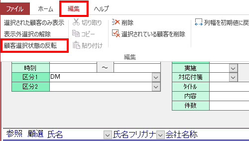 | (5) | 表示・選択されている顧客以外が対象の顧客ということになりますので、画面上部の[編集]メニューをクリックし、[顧客選択状態の反転]をクリックします。 |