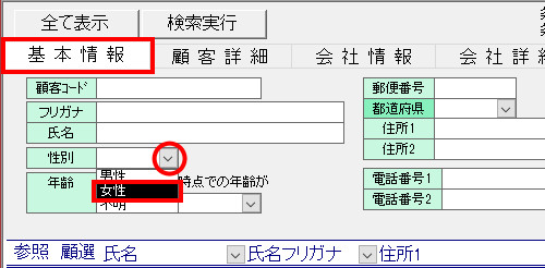 | (2) | [基本情報]タブ内の[性別]欄で、「女性」を選択します。 |