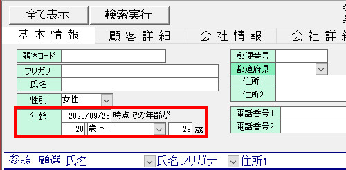 | (3) | [年齢]欄の設定を行います。上段で年齢の基準となる日付(いつの時点での年齢で検索するか)を設定し、下段の[▼]ボタンをクリックして年齢の検索条件を選択します。「20代」を検索するには「歳〜」を選択し、「20歳〜29歳」と設定します。 |