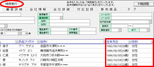 | (4) | [検索実行]ボタンをクリックすると、「20代の女性」が抽出されます。 |