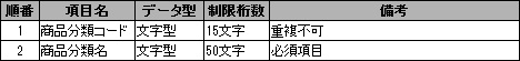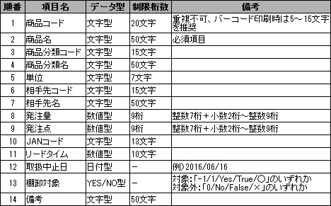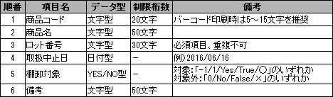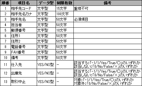| 取り込み元ファイルの1行目には各項目名を入力してください。項目名や並び順は任意ですが、データ型や文字数等は以下の表の条件を満たしている必要があります。 |