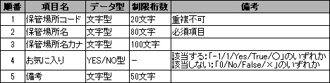 | ●保管場所台帳インポート仕様(在庫らくだプロ7.5以降) |