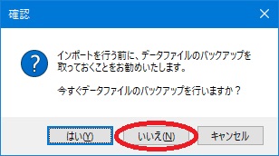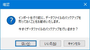 | (3) | 「〜今すぐデータファイルのバックアップを行いますか?」という確認メッセージが表示されます。取込先が空の状態であれば、[いいえ]ボタンをクリックして進みます。既にデータが入っている場合には、[はい]ボタンをクリックし、バックアップをお取りください。 |