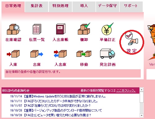 | (1) | メインメニューの[設定]アイコンをクリックし、表示される「設定」画面から、[データファイル]項目をクリックし、[データ取込(インポート)]ボタンをクリックします。 |